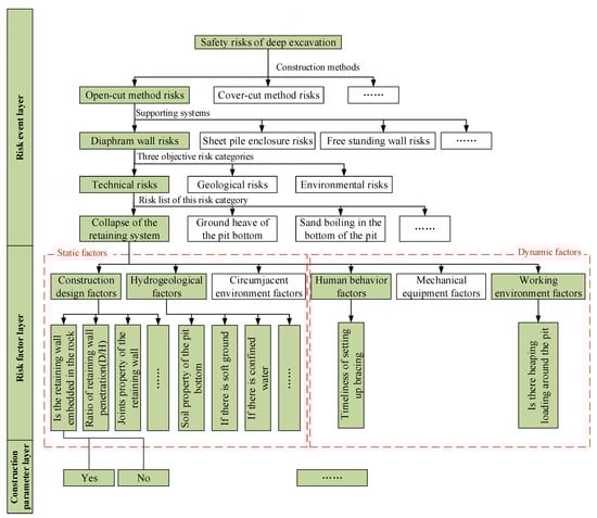 Deep excavation construction is a dynamic engineering process with typical features such as time-space and environmental effects, technological complexity, and important variations depending on site conditions. These features result in increased and uncertain safety risks throughout the project life cycle, which makes a project prone to casualties, schedule delays, and cost overruns [,]. The safety risk statuses involved in the construction process are changeable because the total life cycle of a deep excavation project is long and affected by various dynamic factors. Thus, performing timely safety risk identification is critical during the preconstruction and construction phases to issue early warnings and adopt preventive measures for the reduction of safety risk events [].