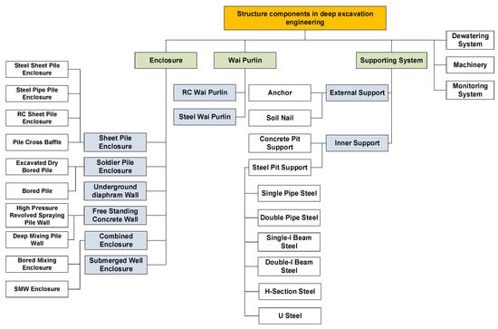 Figure 4 shows the main structural components in deep excavation, which are classified into different categories and systems (e.g., enclosure, wai purlin, and machinery parts, support (the temporary structure), dewatering, and monitoring systems) according to their typical engineering characteristics. In the following context, the enclosure, the wai purlin, and the supporting system are emphasized to show the IFC expression of the design information (I-1), focusing on its primary and secondary components.