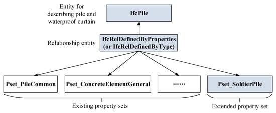 Figure 5 shows the extension of the pile entity (IfcPile) as an example. Relationship entities, such as IfcRelDefinedByProperties or IfcRelDefinedByType can be utilized to establish the relationships between IfcPile and its associated property sets (including the existing sets and the extended Pset_SoldierPile). In correspondence with construction parameters related to risk factors, the properties contained in the extended property set Pset_SoldierPile are shown in Table 3.