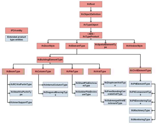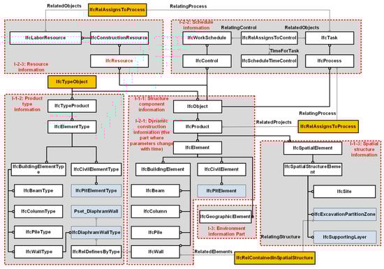 The construction phase of a deep excavation project is often a long-term and complex process, which consists of various tasks to be completed by multi- and subcontractors. In this phase, various construction information can be involved, such as quantity, schedule, resource, cost, site layout, safety management, and quality evaluation [,]. IFC description studies on this construction information can be found in the literature [,,,]. Considering the purpose of realizing automatic safety risk identification of the entire deep excavation, this study mainly focuses on the schedule, resource, and quality evaluation of the construction process, which are construction information related to safety risk factors.