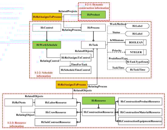 The IFC expression of construction information (I-2) is briefly described in Figure 9. Dynamic construction information (I-2-1) refers to information that may change as the construction stage varies (e.g., the quality evaluation of concrete pouring) []. Schedule information (I-2-2) represents the relevant time information in I-2-1, which is expressed using the IfcWorkSchedule entity. Resource information (I-2-3) is expressed using the IfcResource entity.