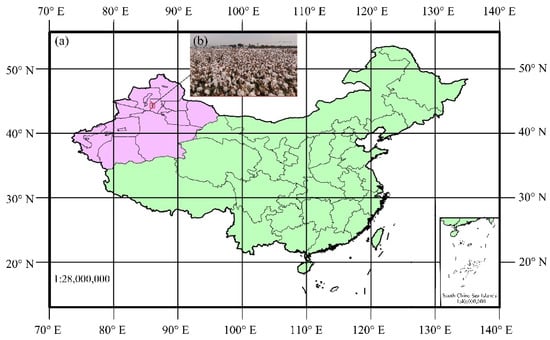 The situation of the experiment filed. (a) the specific geographical location of the experimental field, in which is 88.99° E, 44.31° N; (b) Experimental cotton field.