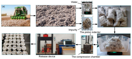 The experiment procedures. (a) mechanized harvesting; (b) machine-harvested seed cotton sampling; (c) rehydration (adding impurities) treatment machine-harvested seed cotton samples; (d) processed samples; (e) feeding quality control; (f) guarantee of initial density; (g) machine-harvested seed cotton compresses and strain remains 300 s; (h) machine-harvested seed cotton molding.