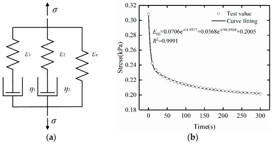 The stress relaxation of machine-harvested seed cotton with 6% moisture content, 12% trash content and 300 kg/m3 compression density were used as an example, and the stress variation curve of machine-harvested seed cotton with time is plotted when its strain remains 300 s. Using Origin 2017 to fit the regression to it using the Maxwell model and generalized Maxwell model, we can obtain the expression of stress relaxation characteristics of machine-harvested seed cotton, which can be used in 2 Maxwell cells and 1 equivalent spring parallel five-element model [23], as shown in Figure 3a, and the expression is shown in Equation (3).
