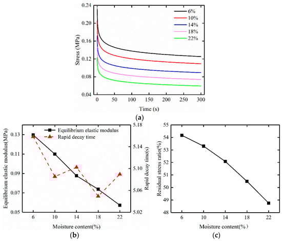 Stress relaxation characteristics at different moisture contents: (a) Stress relaxation curve; (b) Equilibrium elastic modulus Ee and rapid decay time T1; (c) Residual stress ratio ε.