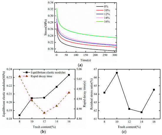 Stress relaxation characteristics at different trash contents: (a) Stress relaxation curve; (b) Equilibrium elastic modulus Ee and rapid decay time T1; (c) Residual stress ratio ε.
