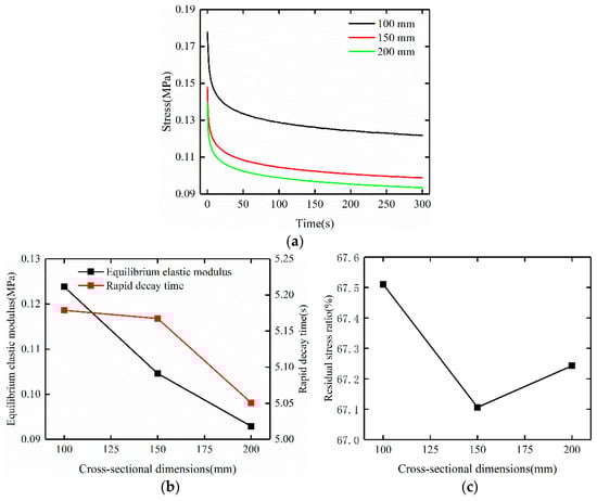 Stress relaxation characteristics at different cross-sectional dimensions: (a) Stress relaxation curve; (b) Equilibrium elastic modulus Ee and rapid decay time T1; (c) Residual stress ratio ε.