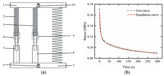 Stress relaxation virtual prototype model and test results: (a) Model: 1. upper pressure head 2. spring 1 3. spring 2 4. prismatic pair 1 5. damper 1 6. fixed constraint 1 7. lower pressure head 8. damper 2 9. prismatic pair 2 10. fixed constraint 2; (b) Curves comparison between simulation and test results.