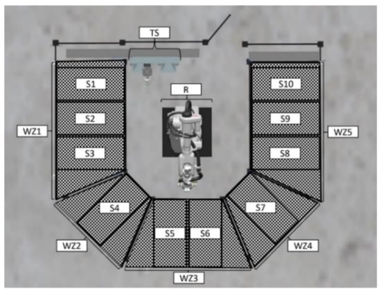 For a top view of the Plug and Produce, the IRB 6700 (marked R), its five WZ, the TS and ten slots (marked S1–S10) for mobile process modules, see Figure 1.