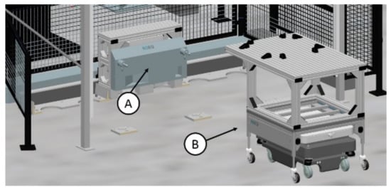 (A) A docking station module and (B) an AMR and a transport module. The figure is a snapshot from a simulation in RobotStudio.