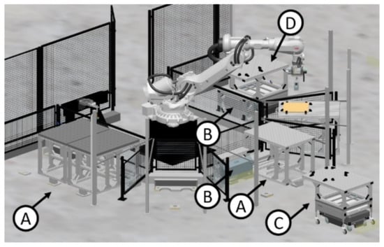 This figure shows the Plug and Produce cell configured with standard mobile process modules (A), docking station modules (B), an AMR including a transport module (C), and a docked transport module (D). The figure is a snapshot from a simulation in RobotStudio.