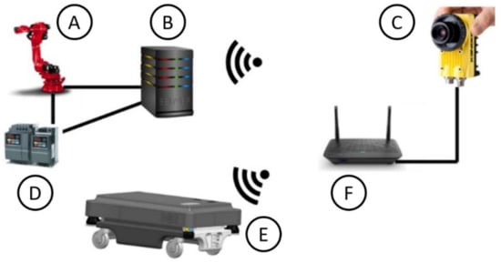 Shows the IIoT communication infrastructure which consists of both wired and wireless communication. Wired communication is conducted between an IRC 5 OPC DA server (A), an OPC UA server (B), and a safety PLC OPC UA server (D). Wired communication is also conducted between a Cognex D900 camera (C) and a Wi Fi router (F) to enable (C) for wireless connections. Wireless two-way communication is conducted between the OPC UA server (B) to (C) to (E). (C) and (E) are not communicating to each other directly.