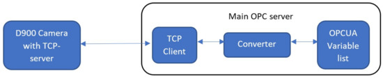 A TCP client was embedded, into the main OPC server, to obtain calculated variables. In this case a string with coordinates, from the vision system to the main OPC server, see Figure 6. When the TCP client and the cameras TCP server are connected, the output string from the camera can be read by the TCP client. Variables are then converted from a string into formatted OPC UA variables and published on the main OPC server.
