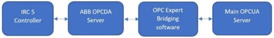 The IRB 6700 has a vendor supplied OPC DA server that can be installed and connected to its IRC5 robot controller. The OPC DA extracts all IO signals and all persistent variables inside the RAPID programs, that resides inside the IRC5 controller, and publish these on the OPC DA server. In this case, a direct OPC DA to OPC UA communication is not set up. Instead, an OPC bridging software called OPC Expert is used to connect the python OPC UA server variables to the IRB 6700:s OPC DA server, see Figure 7.