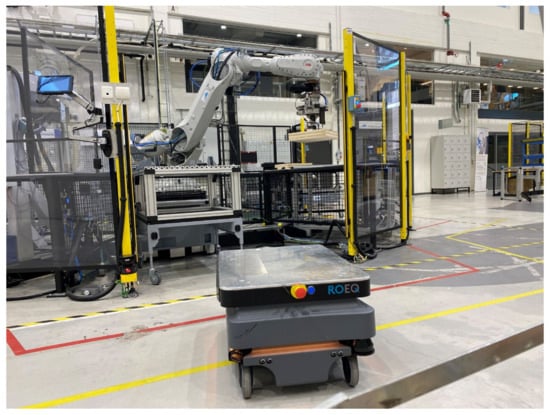 The physical setup of the Plug and Produce cell, including robot tools, an AMR and process modules, mirrors the digital twin which is described in 3.1 Flexible Robot Cell. The physical Plug and Produce cell, including the AMR, which is used in the demonstrator, can be seen in Figure 8.