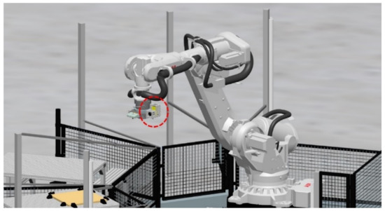 Shows where the protective housing, for the Cognex D900 camera is fixed on the IRB 6700:s tool changer. The protective housing is seen inside the dashed circle. The figure is a snapshot from a simulation in RobotStudio.