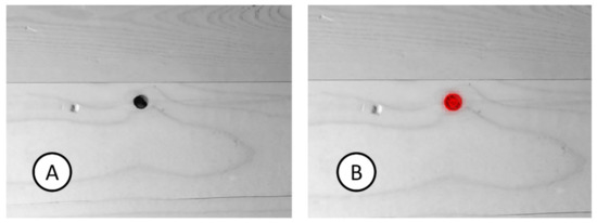 This figure shows a wood surface with a knot hole. An unprocessed picture is shown in (A,B) shows a processed picture where the knot hole has been detected and a heatmap has been applied, by the program, to highlight the detected defect.