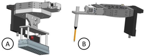 Figure 11. This figure shows two tools used by the IRB 6700 in the surface inspection. (A) Shows the vacuum gripper and (B) shows the pen tool. - The IRB 6700 places the CLT panel on an inspection module in S7, see Figure 12. The location of S7 is seen in Figure 1.