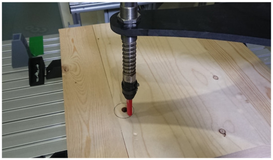 Figure 13. This figure shows the robot pen tool indicating a knot hole defect on the CLT panel by drawing a circle around it. - The IRB 6700 then switches back to the vacuum gripper and picks the CLT panel from the inspection module in S7, see Figure 8.