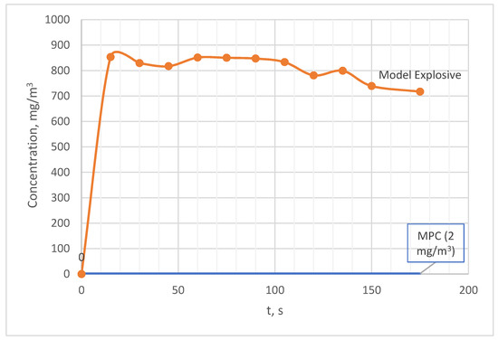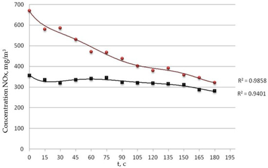 The results of the conducted studies of the mass concentrations of nitrogen oxides released from the explosion of the model composition without the addition of catalysts are shown in Figure 4.