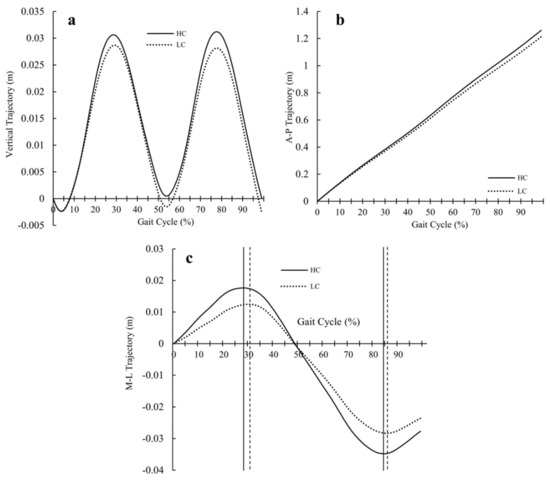 Average COM trajectory excursion graphs for LC and HC: (a) vertical trajectory graph, (b) anterior-posterior trajectory graph, and (c) mediolateral trajectory graph (the continuous and dotted vertical lines mark the peak occurrences for HC and LC).