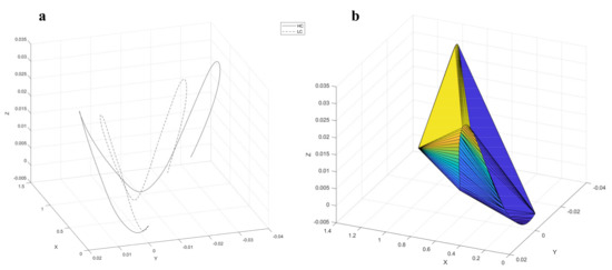 Visualization of three-dimensional COM trajectory: (a) HC and LC average COM trajectory, and (b) example of the volume encompassed by the COM trajectory.