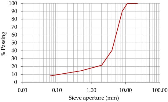 The asphalt mixture selected for the study was a stone mastic asphalt with maximum size of aggregate 8 mm—SMA 8—designed according to the EN 13108-5 []. Figure 1 shows the particle size distribution of the aggregate mixture. Three aggregate fractions, obtained from crushed gabbro rock, were used to achieve the final mixture of aggregates: 0/6, 2/6, and 6/12 (the numbers d/D represent the minimum and maximum nominal sizes of the aggregate fraction). The dosages by mass of aggregates were 7%, 19%, 54%, and 20% for the fractions of filler 0/6, 2/6, and 6/12, respectively.