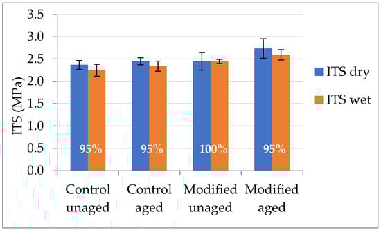 The asphalt mixtures presented adequate performance in indirect tensile strength (ITS) and indirect tensile strength ratio (ITSR). The results of ITS and ITSR of the control and modified mixtures, under unaged and aged conditions, are presented in Figure 2. The error bars represent the respective standard deviation. ITSdry and ITSwet are the ITS of specimens under dry conditions (with no water sensitivity conditioning) and water sensitivity conditioned, respectively.