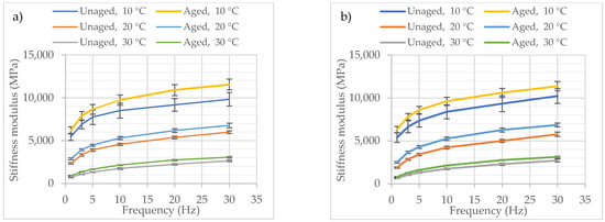 Stiffness modulus of the control (a) and modified (b) SMA 8 in unaged and aged conditions.