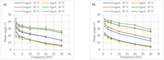 Phase angle of the control (a) and modified (b) SMA 8 in unaged and aged conditions.