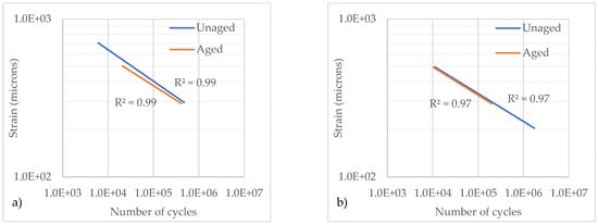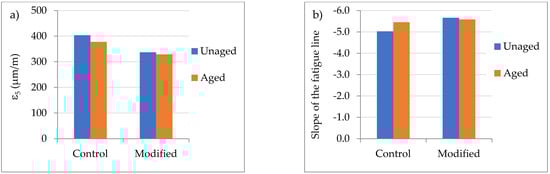 The fatigue lines, and respective coefficients of determination (R2), of the control and modified asphalt mixtures under unaged and aged conditions are presented in Figure 5. Complementary results of the fatigue tests, namely, strain corresponding to the application of 100,000 loading cycles () and the slope of the fatigue line (that is an indicator of the mixture’s sensitivity to the applied loading strain level), are presented in Figure 6. After the aging process both asphalt mixtures, control and modified, presented worse resistance to fatigue. This behavior was expected, as the aging process causes hardening of the asphalt mixtures inducing a more brittle behavior. Nevertheless, the differences between unaged and aged asphalt mixtures were small, particularly if considering the dispersion of results commonly associated with the fatigue tests.