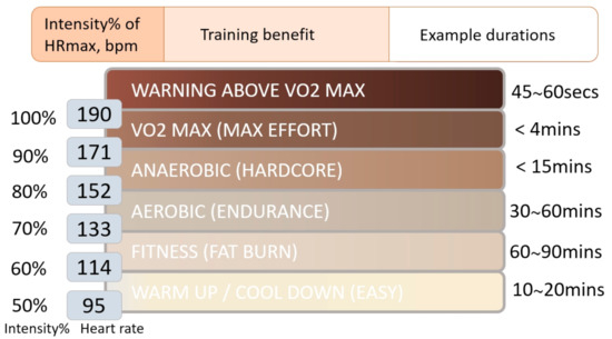 Heart rate is the most easily acquired physiological information. When heart rate is monitored during exercise, it can reflect the strengths and weaknesses of cardio-respiratory function [30]. During exercise, the heart rate can be improved according to a range of indicators, such as age. A heart-rate target range should be 75% of the body’s highest heart rate. Age is also an important heartbeat indicator. This factor is related to monitoring a subject’s evaluated physiological condition, and the general center jump is between 50% and 80%, as shown in Figure 2.