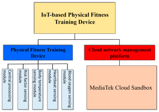 The physical fitness training management device developed in this research includes a physical fitness training management and cloud network management platform. Figure 3 shows the architecture of the device. The physical fitness training management aspect is mainly responsible for measurement. The sensed physiological data is uploaded to the cloud using the 4G network management platform. The fitness management device consists of a central processing module and sensing modules, such as a temperature sensing module, a risk factor module, and a heartbeat sensing module, as shown in Figure 4. The central processing module is responsible for receiving the temperature data from the sensing module, sensing the heartbeat information, and measuring the risk factor. The device then uses a radio transmission module to upload the data to the cloud network management platform. When the device determines that the test subject is in an abnormal condition, a warning signal and notification will be sent by the cloud management system to the trainer and wearer. This paper proposes to use the IoT to return user physical indicators. Since the 5G “Internet of Things” technology is not yet mature, we propose a method of transmission via the 4G network of the mobile phone. The reason why the mobile phone is not returned is that when the 5G technology matures in the future, this device can operate independently without a mobile phone. On the other hand, under multi-person management, it is more suitable to return data to the server for integrated management.