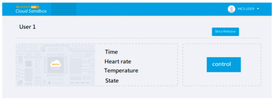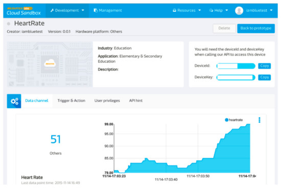 MCS is a free cloud-based platform, which allows fast prototyping of wearable devices for data and device management services, focusing mainly on MECC connectivity. MCS is presented in webpage form and provides the MCS APP for Android and iOS. It can collect its own API data returned from the device and provide a graphical interface to display data in the development of the page. A developer can create a prototype by collecting the information using the MCS from the sensing elements of the device. These data channels can be divided into the following categories: display, controller, and integrated display controller. This type of data channel and display can store and display the data collected by the sensing elements of the device. For example, data on temperature are uploaded from the sensing component of the device, and the MCS will store the data in a time series by monitoring the situation in real time. The MCS can also control the remote terminal through the webpage. The device uses a built-in controller system to control the state of the components within the device.