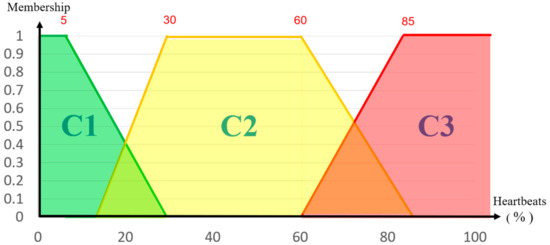 Heart rate is usually measured as the number of times the heart beats in 1 min. Heart rate is automatically calculated by inputting the age and resting heart rate into the proposed system. The heart rate is approximately 50–80% during general exercise. This rate involves minimal sweating, and subjects are conscious of slightly heavier breathing. Thus, the system calculates normal heart rate as C1 (20–40%), moderate as C2 (40–79%), and excessive as C3 (80–100%), as shown in Figure 12.