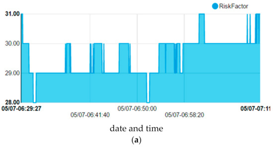 Figure 16d shows that exercise has no obvious effect on the change of blood oxygen value. The reason is that the change of blood oxygen value must be under high-intensity continuous exercise to have a chance to change drastically. We obtain real-time actual data from the sensor, and calculate the risk factor through the chip, as shown in Figure 16. The respective sensing data from Figure 16 used fuzzy calculus to determine the physical indicators in Figure 17. The acquisition and calculation of this information is done in real time on the device.