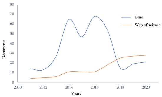 For the analysis of the literature, two search engines (Web of Science and The Lens) were used, in which the disposition of keywords and Boolean operators were applied, as well as the time period of 10 years as the filter (Filter_1). The number articles per year is shown in Figure 3, where a growing trend is observed in the case of the Web of Science (WoS) search engine over the entire time series, but not in the case of the data obtained with the search engine The Lens, where a clear trend is not appreciated; this may be due to the unified system of the search engine that gathers patents and academic documents in a database with the ability to identify intersections between these two types of documents.