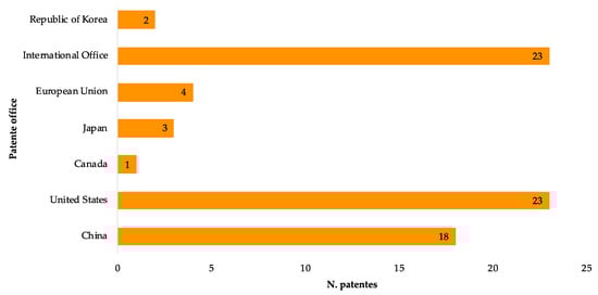 After filtering the documents, 74 patents related to exoskeletons, orthoses, or lower limb devices were selected; the results are shown in Table 3. The main offices from where patents were registered are the United States (23 patents), the European office (4 patents), the international office (23 patents), China (18 patents), Japan (3 patents), Republic of Korea (2 patents), and Canada (1 patent). As shown in Figure 4, the United States is the country with the highest number of patents.