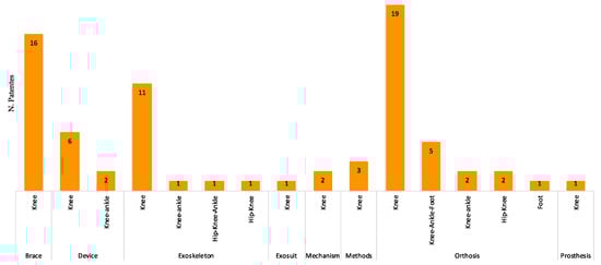 Among the 74 results obtained, 29 results match with orthoses, 16 with braces, 14 with exoskeletons, 7 with devices, 2 with mechanisms, and 1 with exo-suit and prostheses. In addition, three results are associated with methodologies (manufacturing methods, design methods, tests). Figure 7 shows the resulting patents and the distribution with the part of the body of the lower limb that they cover.