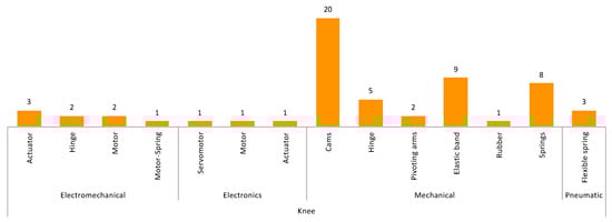 From the patent data, 59 refer to patents related only to the knee joint. In 45 patents, their predominant technology is mechanical, using cams, hinges, pivoting arms, elastic bands, springs, and springs as the main elements to carry out the mobility of the joint. In 11 patents, the predominant technology is electromechanical–electronic using actuators, servomotors, motors, and a combination of motor–spring with which they carry out the movement of the device. For three patents, the technology used is pneumatic, in which the movement of the devices is made using soft elements. Table 3 shows the selected patents, the technology used, the type of device, and the part of the lower limb that they cover. Figure 8 shows the technology used in the patents and the main elements with which they carry out the mobility of the device.
