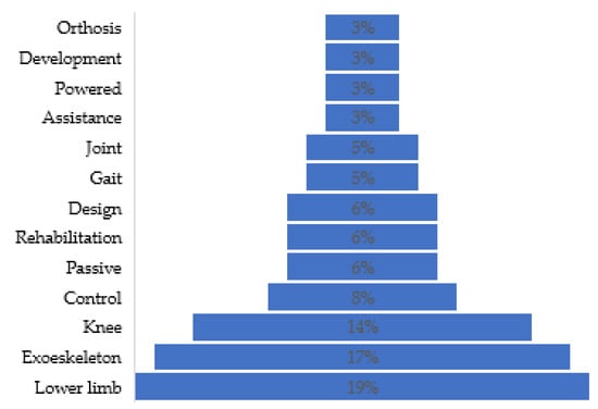 The following keywords were analyzed: lower limb (frequency = 12 articles), exoskeleton (frequency = 11 articles), knee (frequency = 9 articles), control (frequency = 5 articles), design (frequency = 4 articles), rehabilitation (frequency = 4 articles), passive (frequency = 4 articles), joint (frequency = 3 articles), gait (frequency = 3 articles), orthosis (frequency = 2 articles), development (frequency = 2 articles), powered (frequency = 2 articles), and assistance (frequency = 2 articles) (see Figure 9). From the information obtained by the scientific documents, the characteristics of study subjects were as follows: average weight of 75 kg, a knee torque corresponding to 95–150 Nm, and the power in the knee between 50–235 Watts in the movement of flexion and extension.
