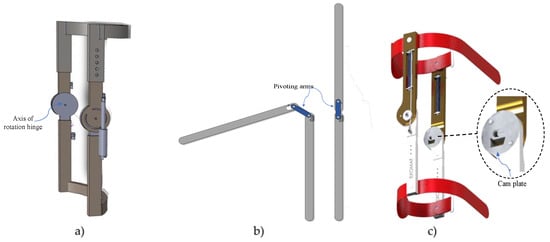 In patents and research articles, we find two different designs in the joint. The first kind of design allows the flexion and extension of the exoskeleton structure through a hinge with a single axis of rotation in the simplest and most generalized way. It provides the exoskeleton with a movement of a degree of freedom. The second is the union through a mobile axis, which is achieved in three ways: pivoting arms, cams, and polycentric pulleys, providing the exoskeleton with two degrees of freedom due to the linear displacement during the rotation that occurs when the axis moves during rotation (see Figure 13).