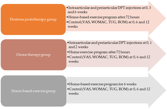 The use of ozone therapy (OT), another treatment method, in the outpatient treatment of KOA is increasing [20]. Ozone therapy has the advantages of being safe to use in intraarticular (IA) approaches and ease of application [21]. Ozone has analgesic, anti-inflammatory effects via stimulation of antioxidant mechanisms, vasodilatation, and angiogenesis [20,22]. OT provides significant improvement in pain and function in the short and medium term treatment of KOA [23,24]. The sources of pain in KOA are the joint capsule, ligaments, synovium, bone, lateral part of the meniscus, tendons and extra-articular ligaments [23,24]. The standard “whole joint” injection method includes IA injections (IA) and multiple periarticular (PA) injections into soft tissues [25]. The whole joint injection method may more effectively reduce pain and improve functional status due to its effects on many points that are the source of pain. There are studies in which DPT has been applied together as IA and PA injections in KOA [26,27,28]. On the other hand, there is no study in which OT is applied using both IA and PA injections, like DPT. The current study applied DPT and ozone treatments to KOA patients with IA and PA methods. The pain relief and improvement in joint function of these treatments were compared with each other and with the home-based exercise treatment program.