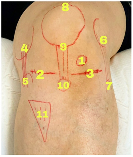 Periarticular injection sites of DPT and OT in the knee with osteoarthritis. (1: intraarticular injection site, periarticular injection sites: 2: medial region of coronary ligament, 3: lateral region of coronary ligament, 4: proximal region of medial collateral ligament and femur, 5: distal region of medial collateral ligament and tibia, 6: proximal region of lateral collateral ligament and femur, 7: distal region of lateral collateral ligament and head of the fibula, 8: quadriceps tendon region of patella, 9: proximal region of the patellar tendon, 10: distal region of the patellar tendon and tuberositas tibia, 11: tendon region of pes anserine).