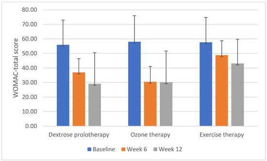 WOMAC-total scores in dextrose prolotherapy, ozone therapy, and home-based exercise therapy groups.