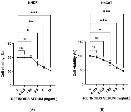Cell viability expressed as a percentage (mean ± SD) after 24 h of treatment on NHDF (A) and HaCaT cells (B) after treatment with the RETINOIDS SERUM compared to the control (untreated cells) (n = 3, replicates = 3). Values of * p < 0.05 and ** p < 0.01 and *** p < 0.001 were considered statistically significant.