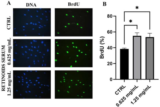 Representative images of immunofluorescence BrdU assay (A) DNA is marked in blue with Hoechst 33258 while BrdU is visible in green. (B) Quantitative assessment of BrdU positive cells expressed as a percentage (mean ± SD) compared to control after 24 h of treatment with the RETINOIDS SERUM (0.625 and 1.25 mg/mL). Values of * p < 0.05 were considered statistically significant compared to untreated cells (CTRL).