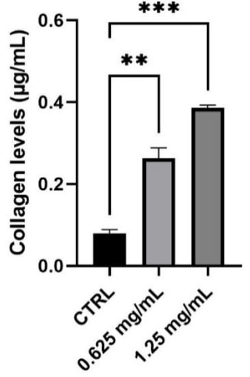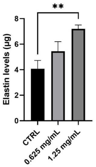 Together with collagen, elastin is the second principal component of ECM representing 2% of the dermis weight. Its role is closely linked to collagen fibers and it is mainly responsible for the elasticity of the skin. After evaluating the production of new collagen in normal human dermal fibroblasts, the synthesis of elastin was also investigated after 24 h treatment with 0.625 and 1.25 mg/mL. As shown in Figure 4, treatment with the product determines a significant increase in elastin levels. In particular, the amount of elastin measured results to be statistically significant with an increase equal to 77% after treatment with the highest concentration (1.25 mg/mL) of the tested product (** p values ≤ 0.01).