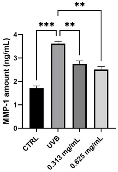 Alterations in the expression of MMP-1 is correlated predominantly to skin photoaging. The possible protection from MMP-1 production was investigated in HaCaT cells using UVB as a source of irradiation. After 24 h treatment, HaCaT cells were treated with the highest non-cytotoxic concentrations of 0.313 and 0.625 mg/mL and UVB irradiation. As shown in Figure 5, the results demonstrated that UVB irradiation markedly increases the MMP-1 production by 55% (*** p values ≤ 0.001), compared to non-irradiated control cells (CTRL). In UVB condition, treatment with the product at the two non-cytotoxic concentrations induced a modest reduction of MMP-1 levels after 24 h, compared to the positive control cells (UVB). In particular, it is possible to observe a significant reduction of 24% and 31% after treatment with 0.313 and 0.625 mg/mL of the product, respectively (** p values ≤ 0.01).