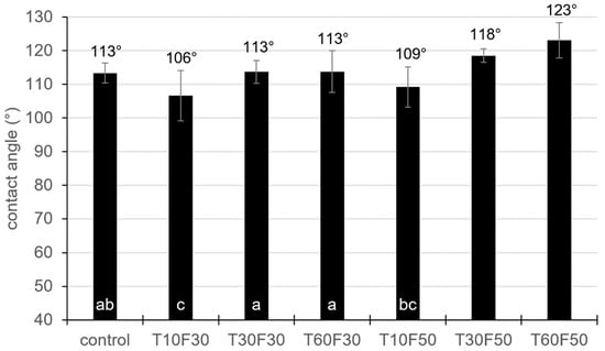 It can be seen in Figure 6 that the untreated sunflower seeds were not so hydrophobic compared to other reported types. Their apparent water contact angle is lower and only achieved 72°. However, it is also clear that the APD treatment of the sunflower seeds had only a negative effect on their wettability. Compared to the untreated sample, the apparent contact angle values were significantly higher for all sets of process parameters, except for the variant T10F50, where the increase was the lowest and statistically nonsignificant (p = 0.338). The most harmful effect was observed for the 60 s treatment at the airflow of 30 SCFH, where the contact angle increased by 38% (approximately 99°, p = 0.000).